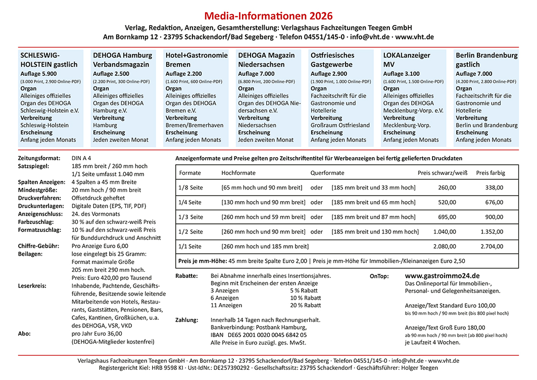 Fachzeitschrift für die Gastronomie und Hotellerie in Schleswig-Holstein. Aktuelles, News und Informationen aus der Branche des Landes und Berichten über die Aktivitäten der DEHOGA-Organisationen